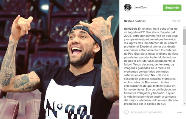 Concentrado com a seleção brasileira em Los Angeles para a disputa da Copa América, o lateral-direito Daniel Alves escreveu um post no Instagram em que confirma sua saída do Barcelona, mas não para sempre. Assim como fez o diretor esportivo Robert Fernandez, do clube catalão, mais cedo, o jogador se limitou a anunciar a despedida, mas sem dizer qual será o clube de destino.